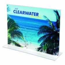 Freestanding plastic T-frame sign holder lets you display signs where you need them most. Two sided for double the impact. Bottom loading. Use on counter or desk. Portrait. 5" x 7". Clear.
